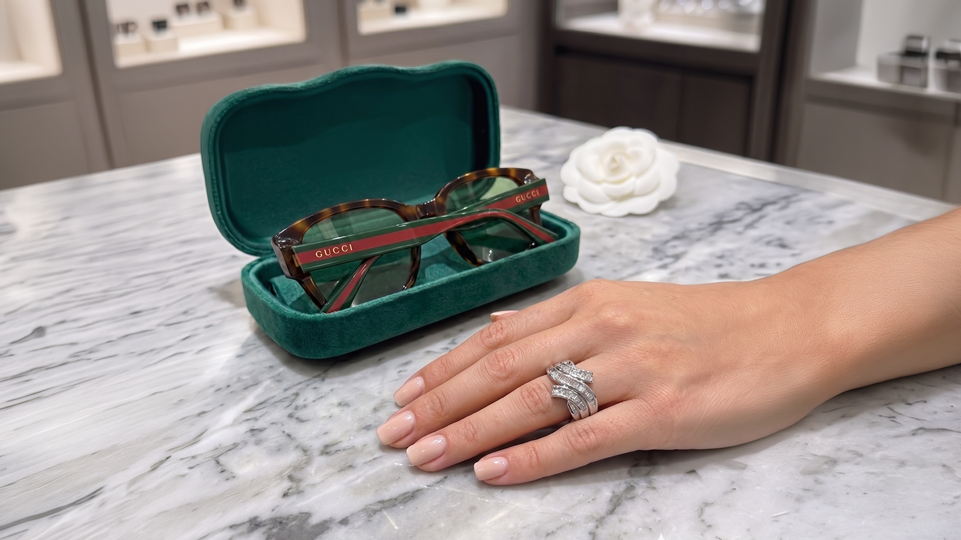 Designer Gucci sunglasses with signature brown striped temples — a refined statement piece and a memorable Mother's Day gift.
